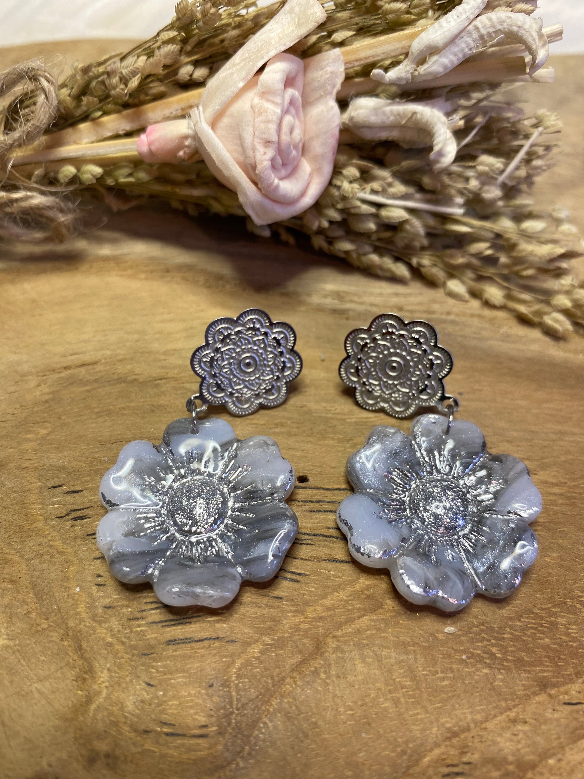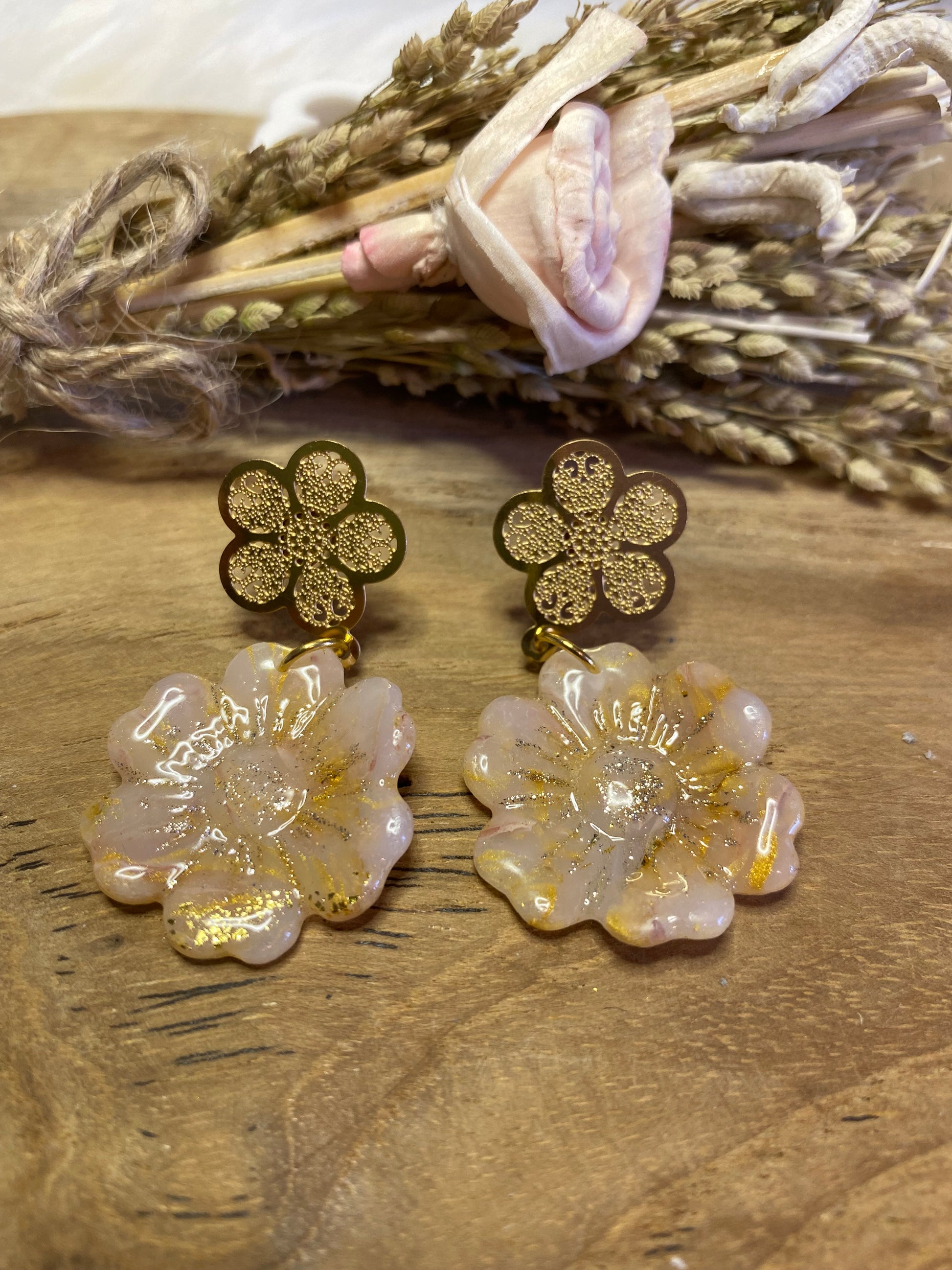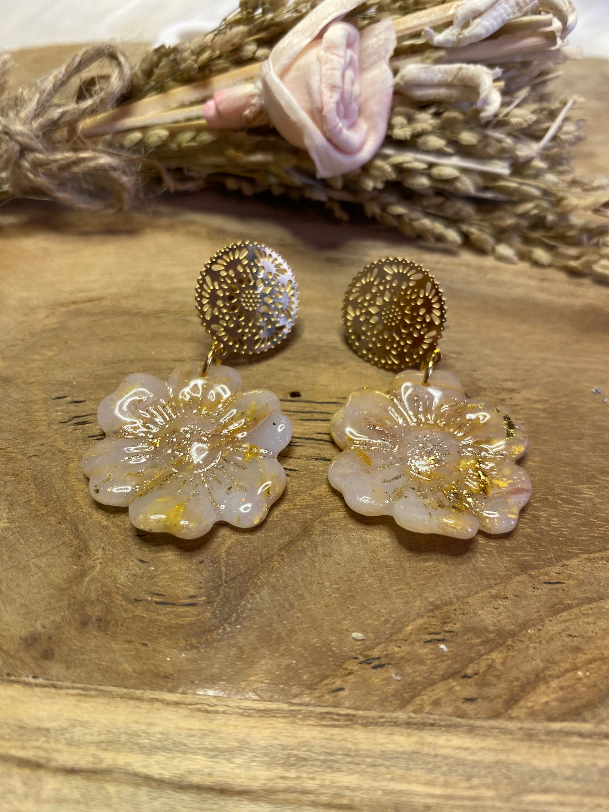 Féminines et poétiques, ces puces d’oreilles en forme de fleurs ondulées sont sculptées à la main en pâte polymère, puis sublimées par une résine brillante. Leur design doux et mouvant rappelle la légèreté des pétales. Une création pleine de douceur, parfaite pour un look délicat et original.