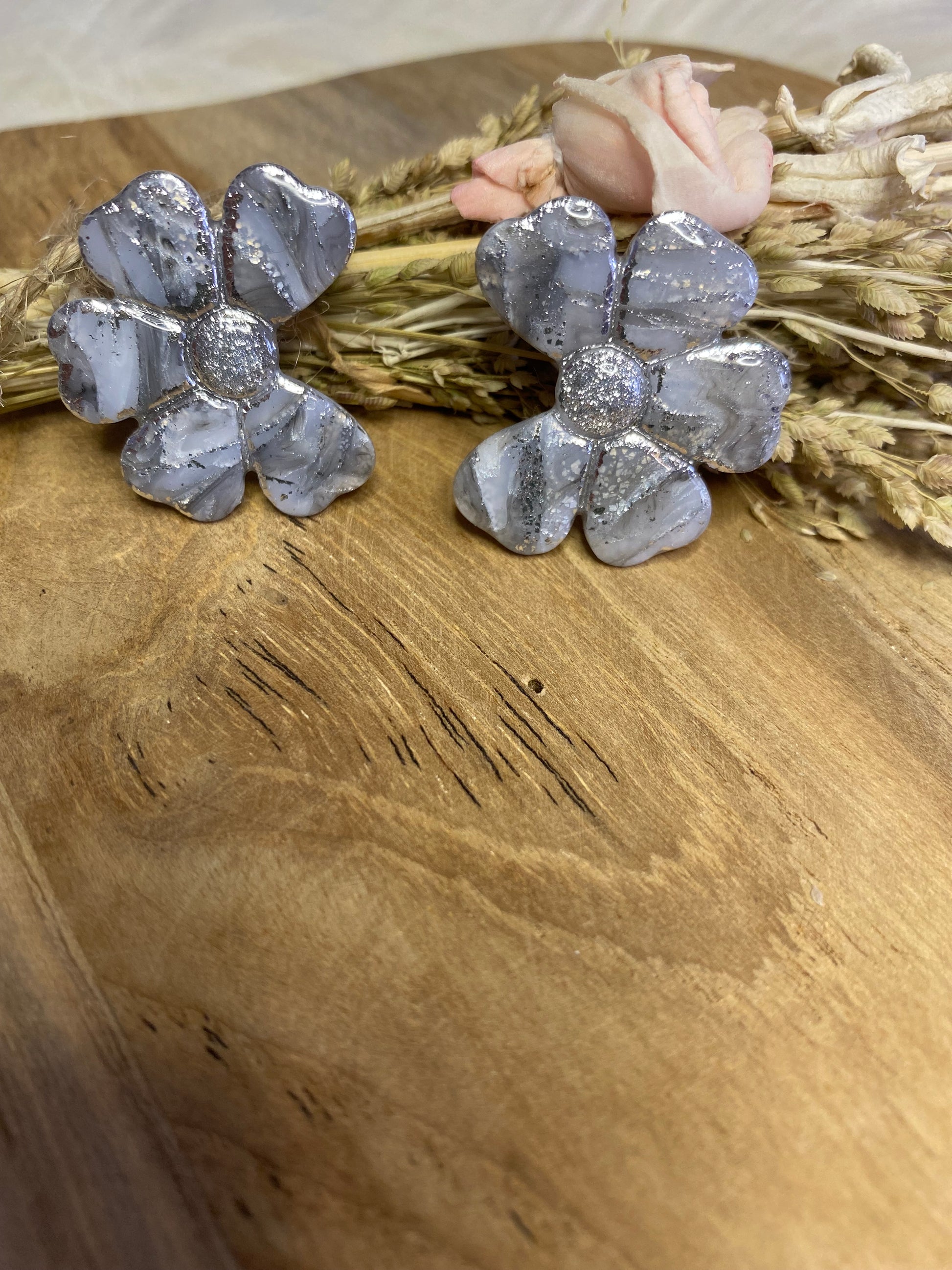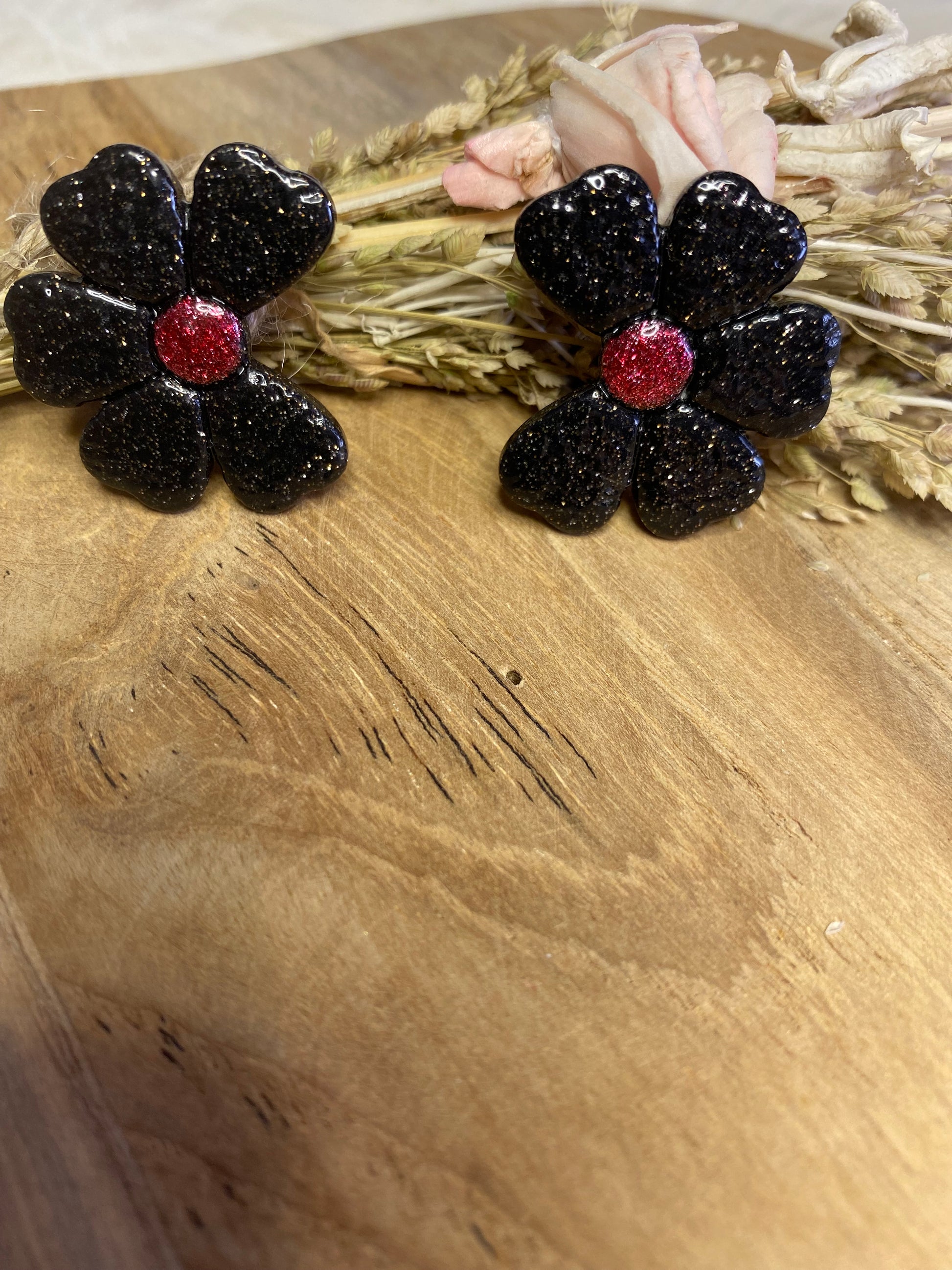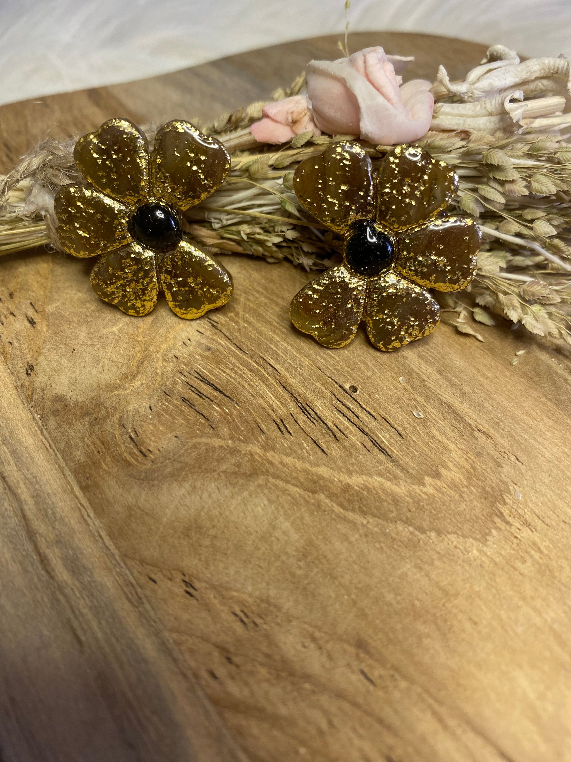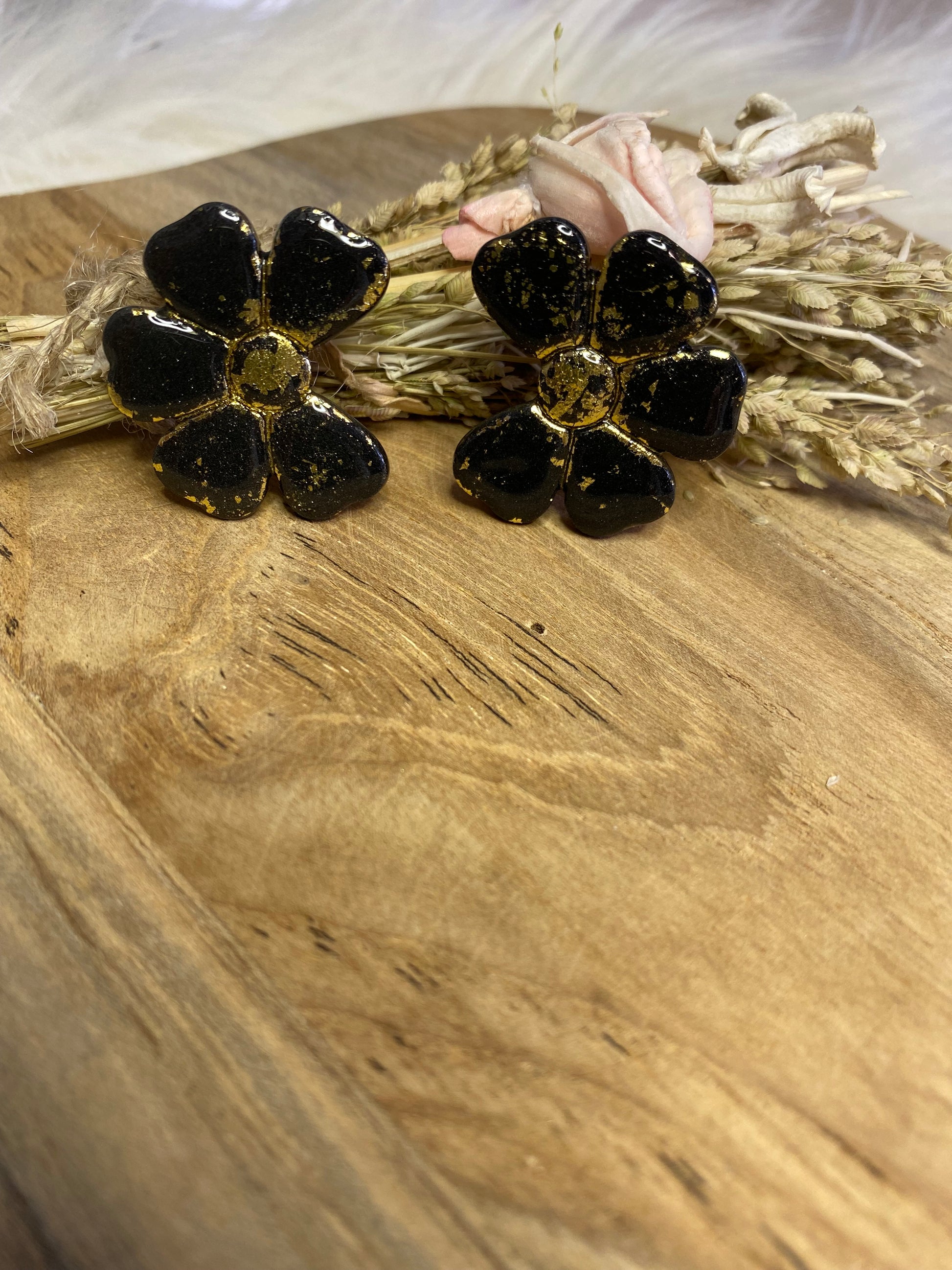 Féminines et poétiques, ces puces d’oreilles en forme de fleurs ondulées sont sculptées à la main en pâte polymère, puis sublimées par une résine brillante. Leur design doux et mouvant rappelle la légèreté des pétales. Une création pleine de douceur, parfaite pour un look délicat et original.