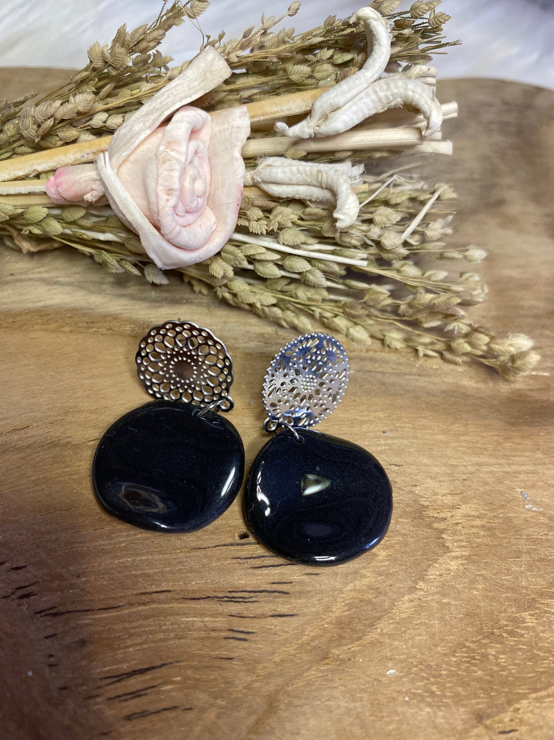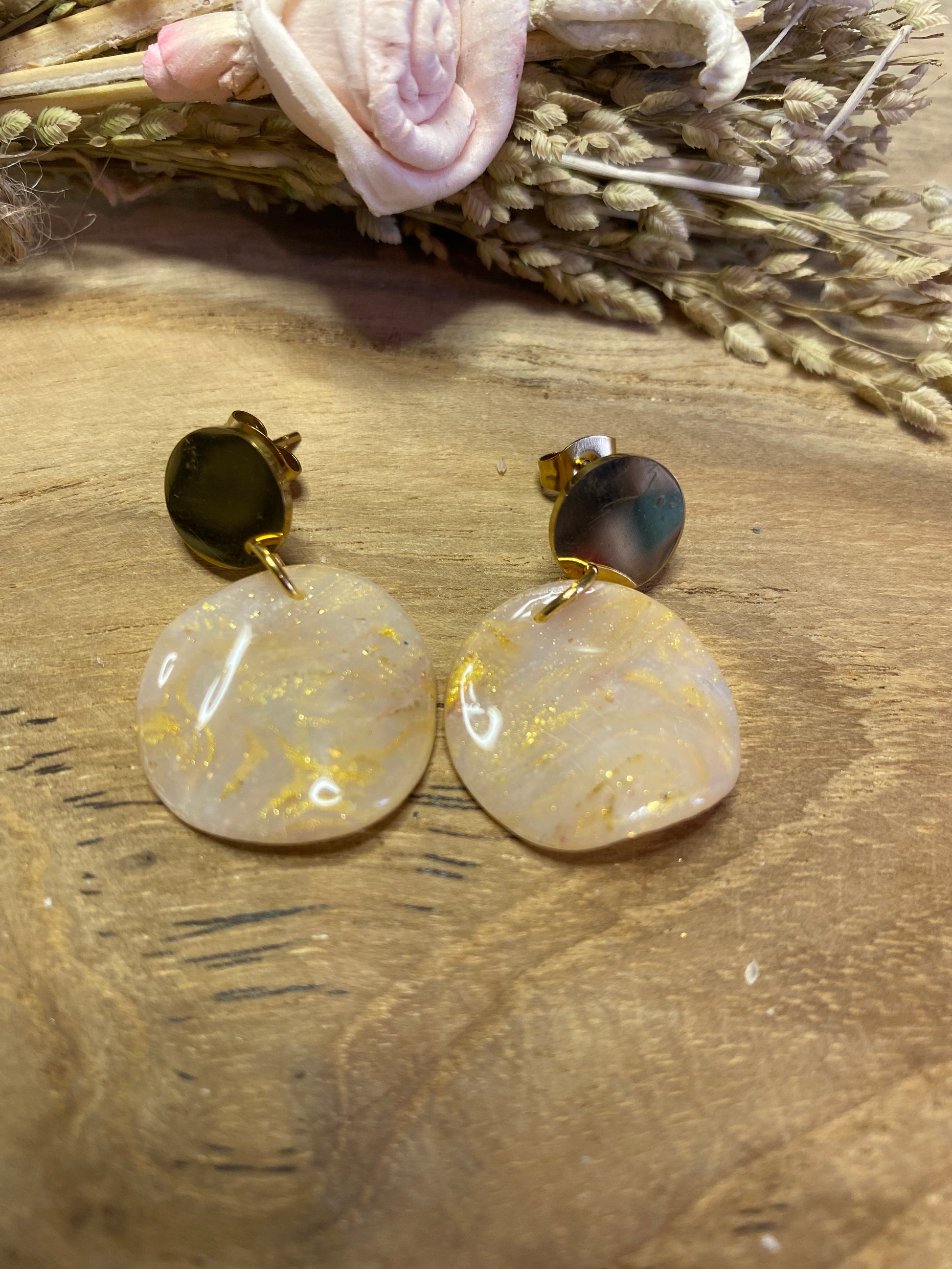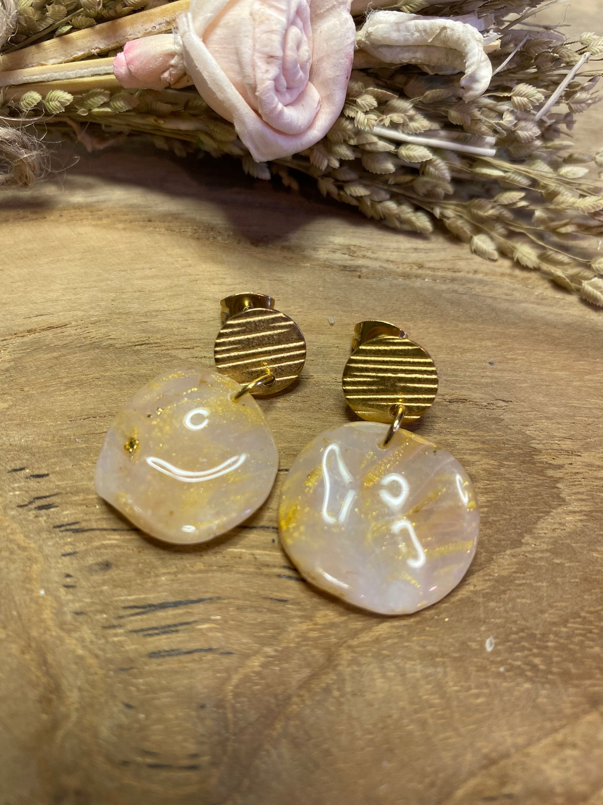 La version plus discrète mais tout aussi raffinée. Ces petites boucles rondes en pâte polymère recouverte de résine UV offrent un éclat subtil et délicat. Idéales pour celles qui aiment les bijoux minimalistes sans renoncer au charme de l’artisanat.