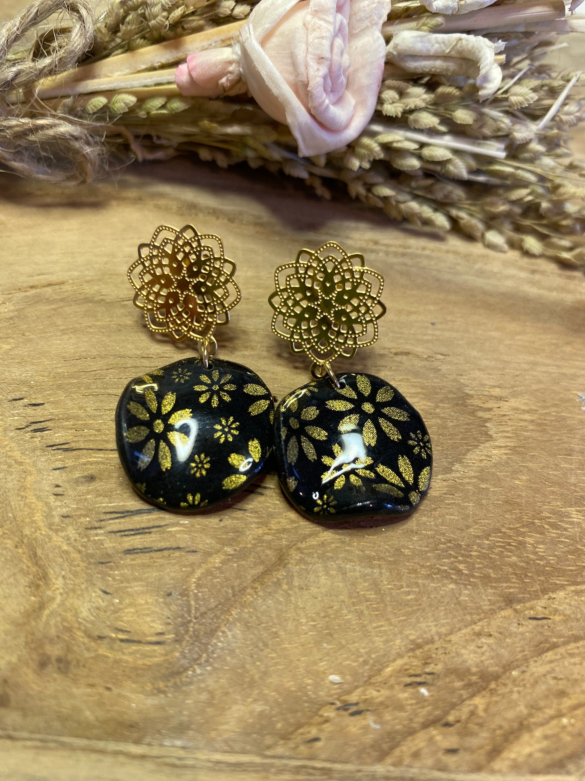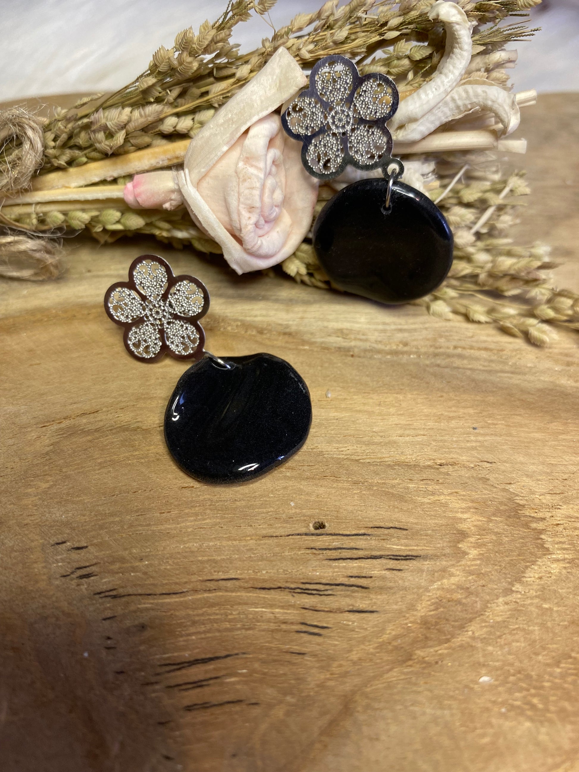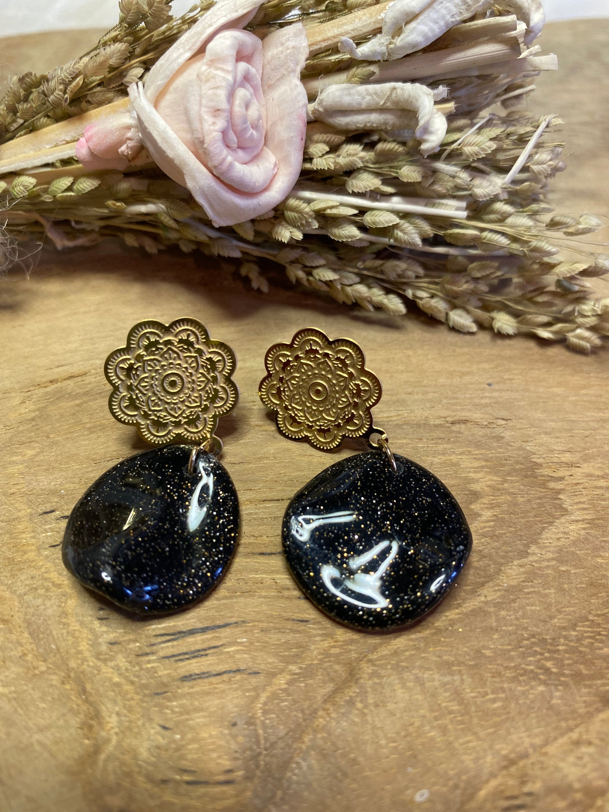 La version plus discrète mais tout aussi raffinée. Ces petites boucles rondes en pâte polymère recouverte de résine UV offrent un éclat subtil et délicat. Idéales pour celles qui aiment les bijoux minimalistes sans renoncer au charme de l’artisanat.