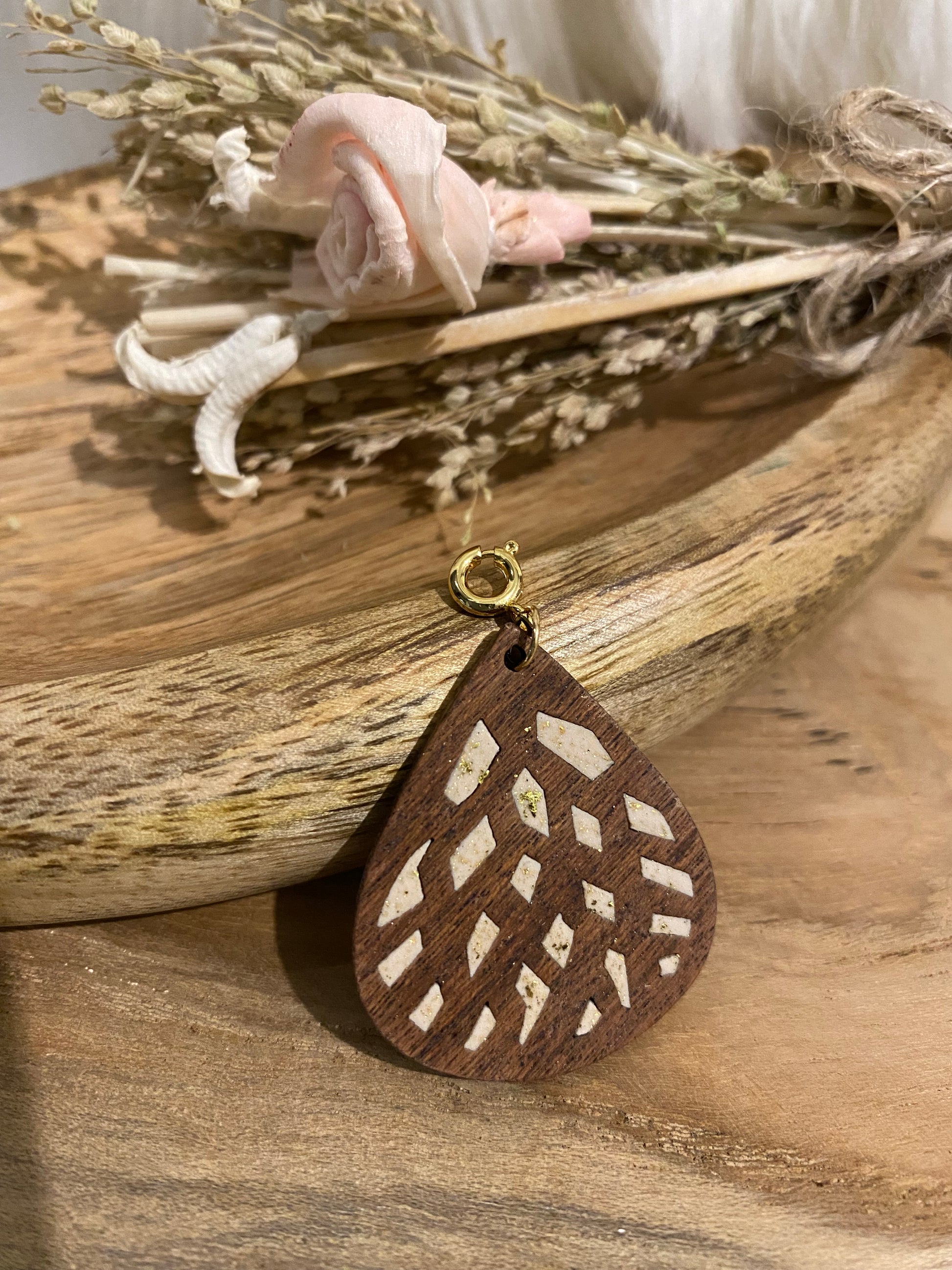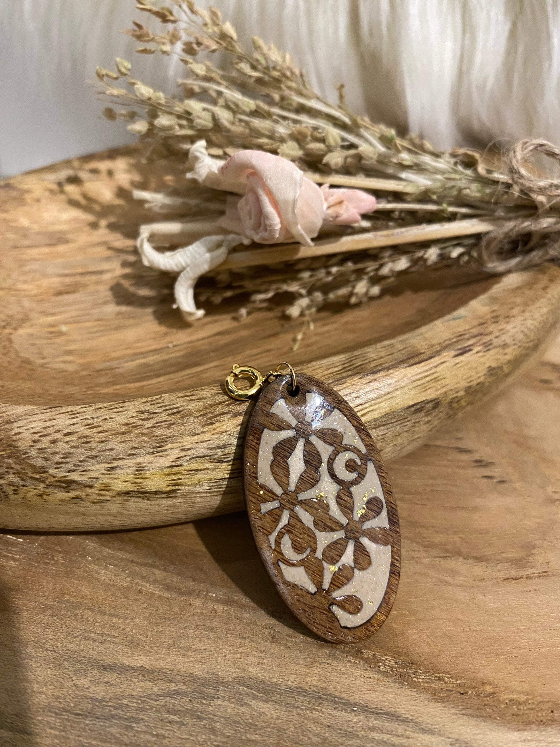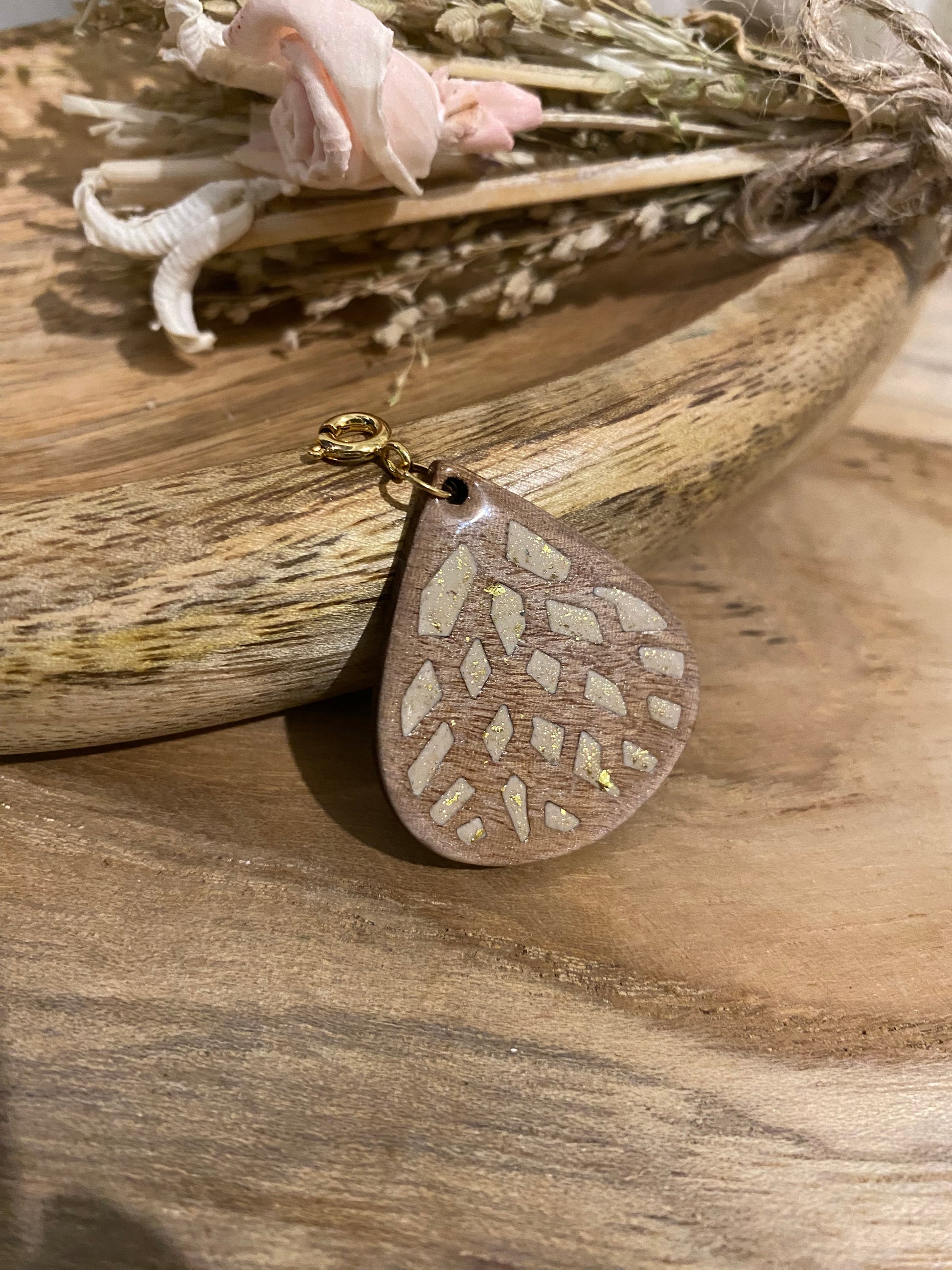 🌿 Pendentif en bois et pâte polymère avec mousqueton